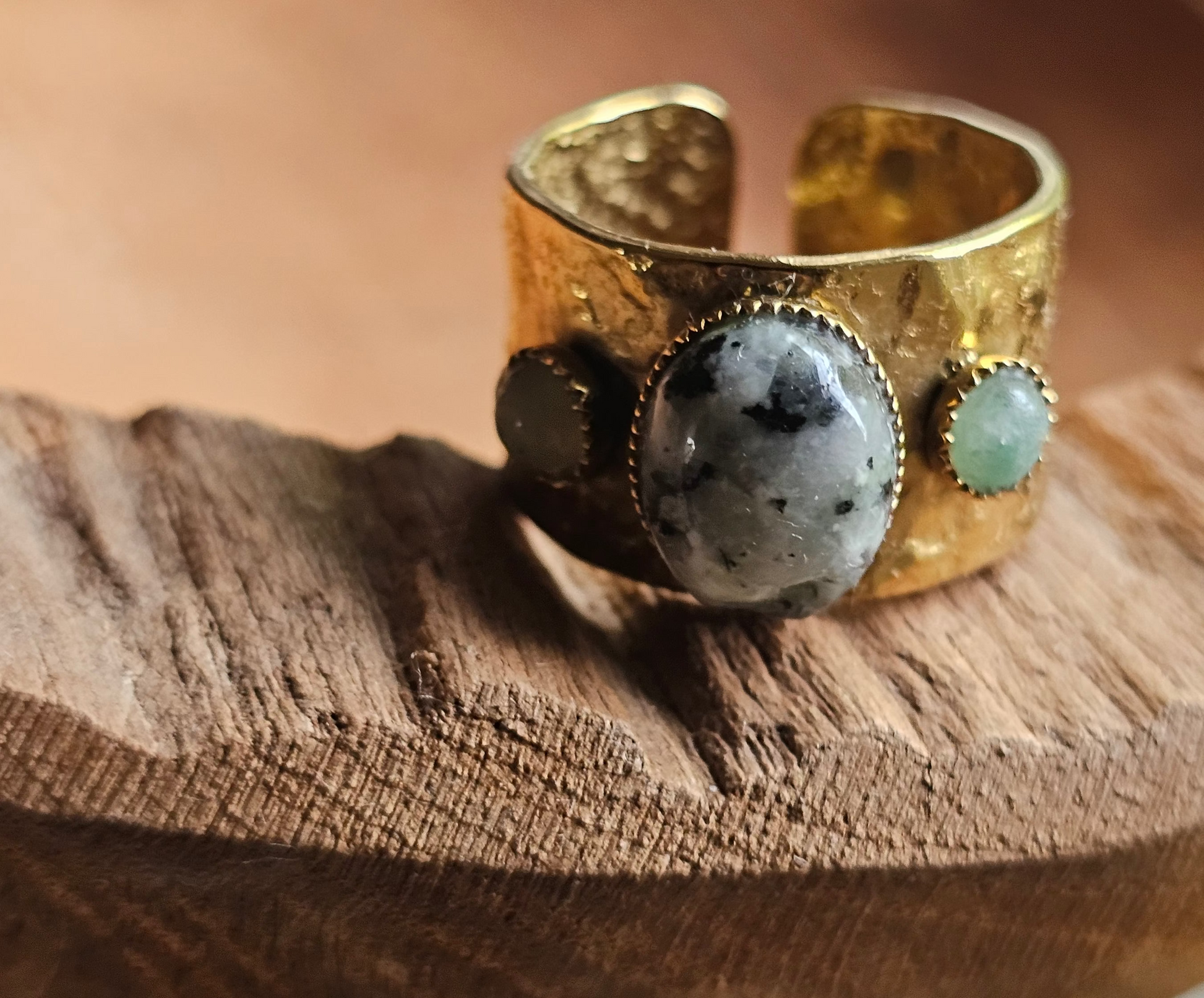 ✨ Bague ajustable Carmen dorée, une création pleine de poésie, ornée de pierres précieuses aux nuances turquoise et vert, sublimée en son centre par une pierre imposante aux reflets gris, noirs et nacrés.