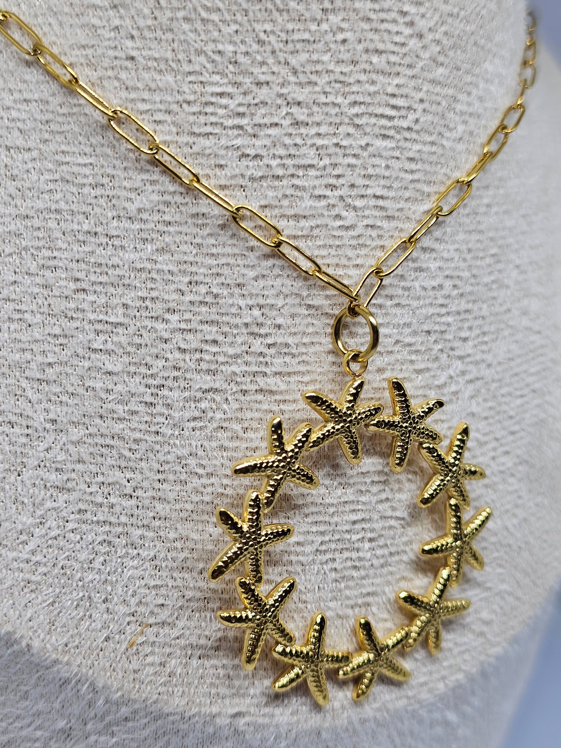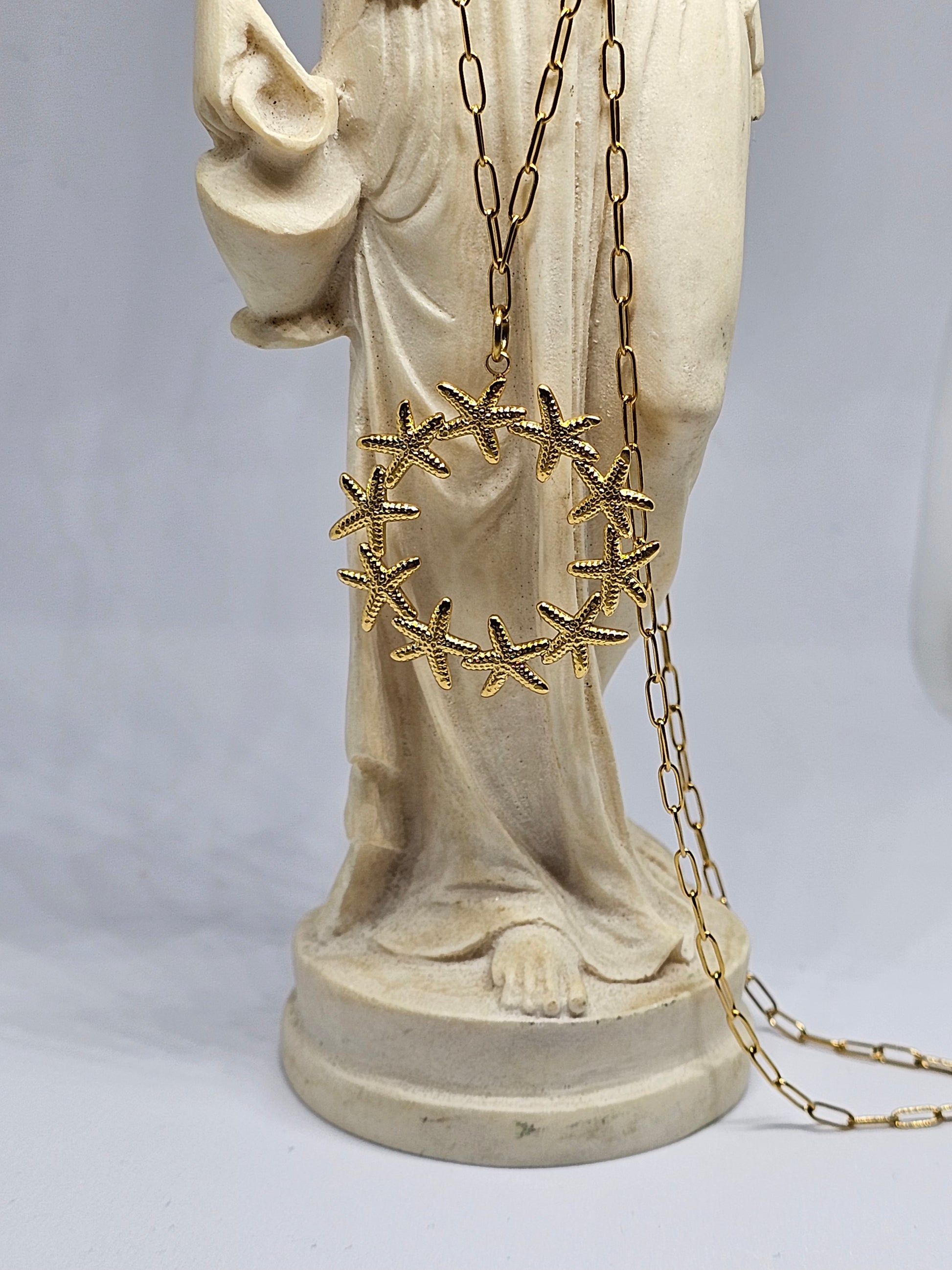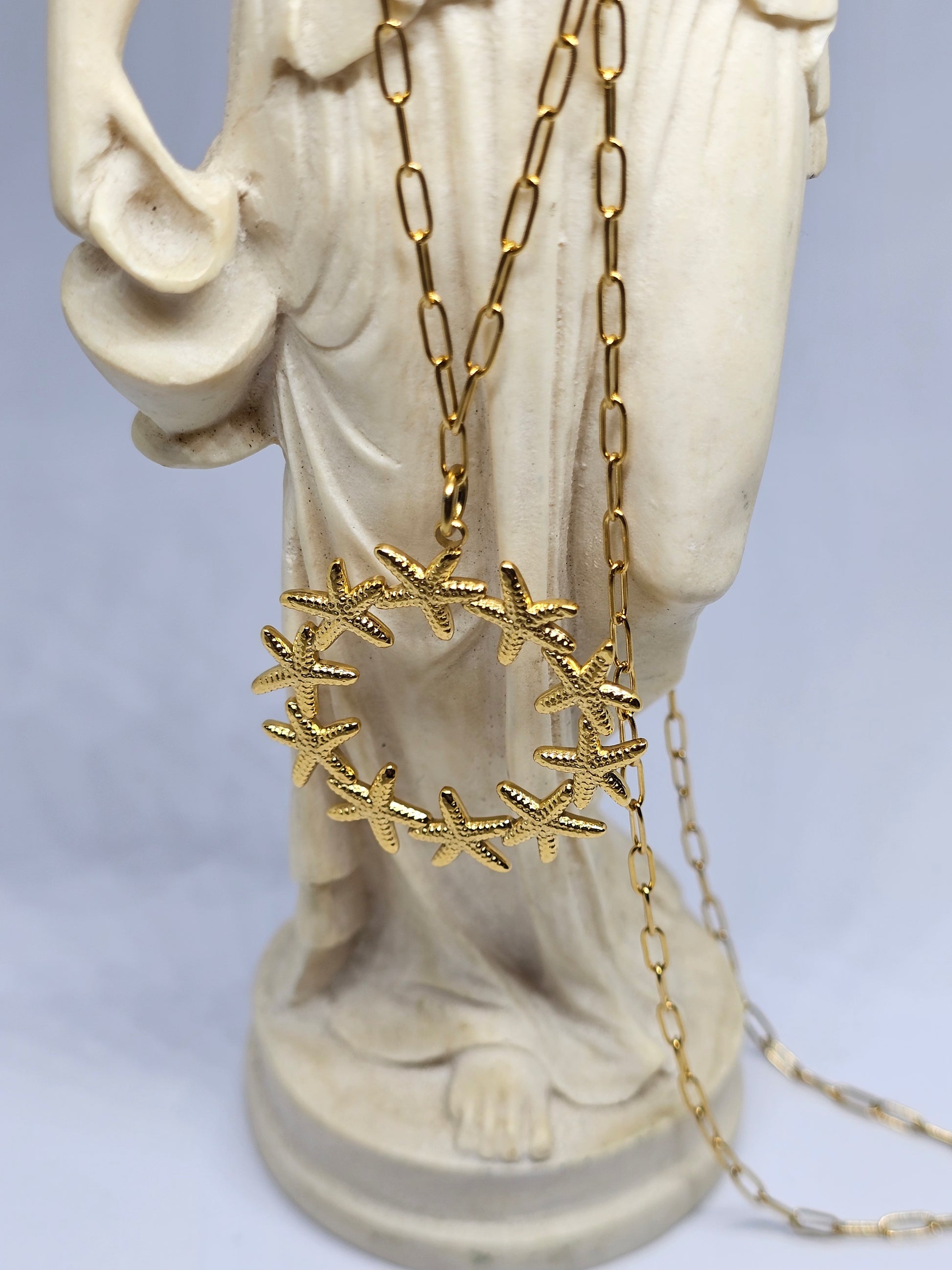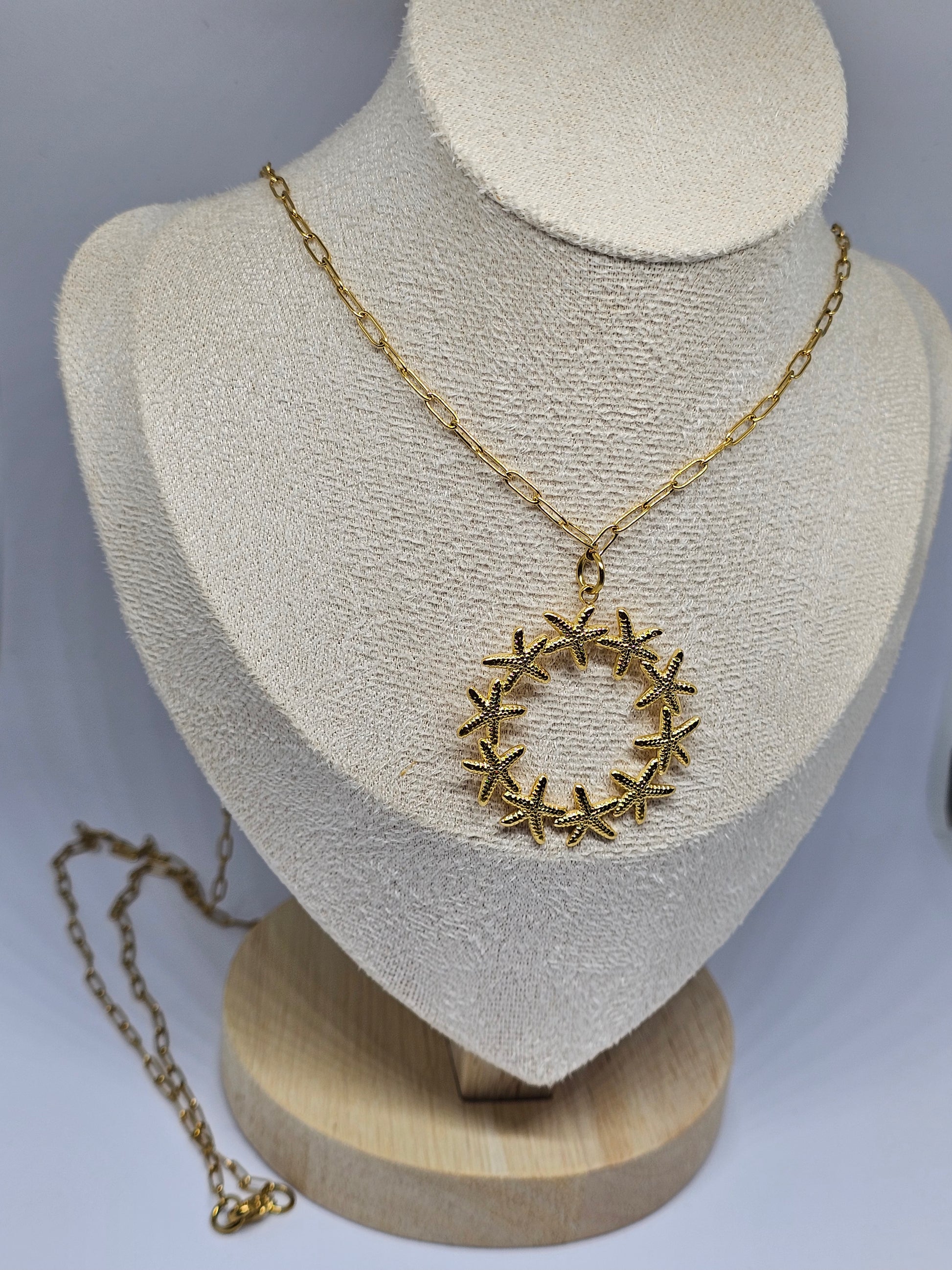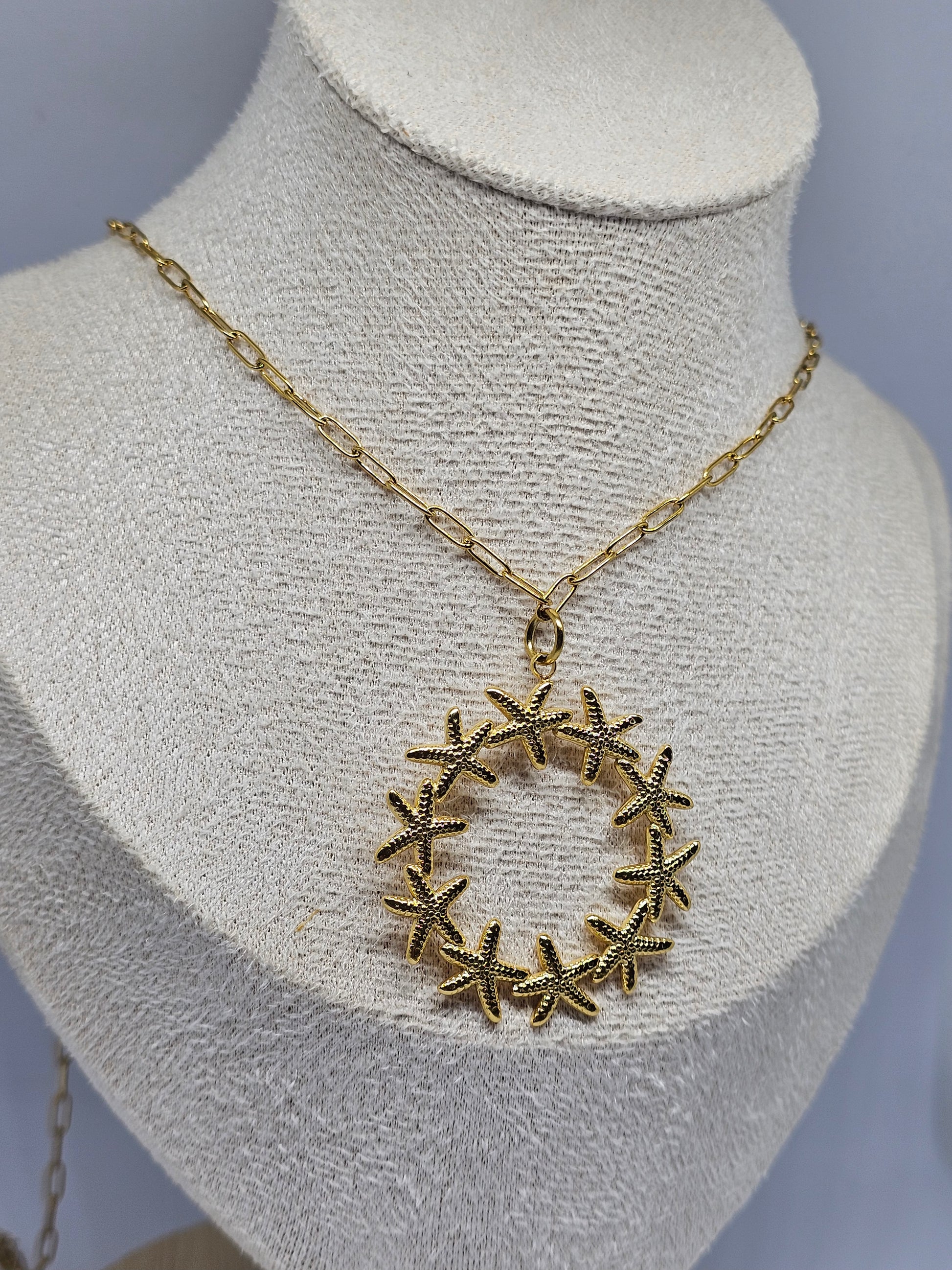 Somptueux et singulier, Atarah se distingue par son pendentif unique, constellé d’étoiles de mer délicatement façonnées en forme de cercle.
