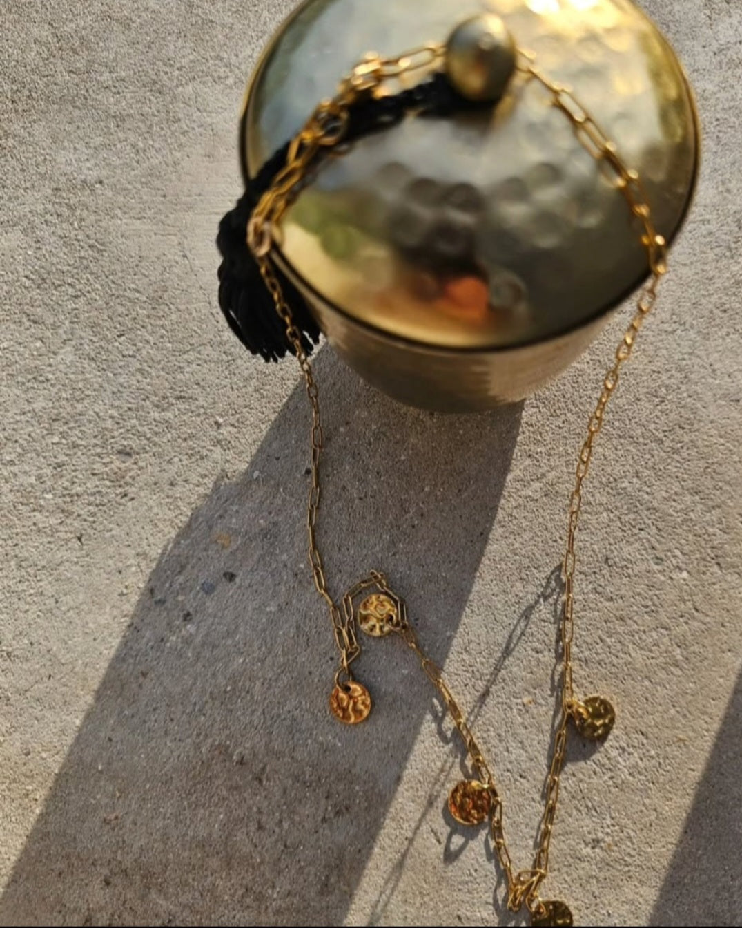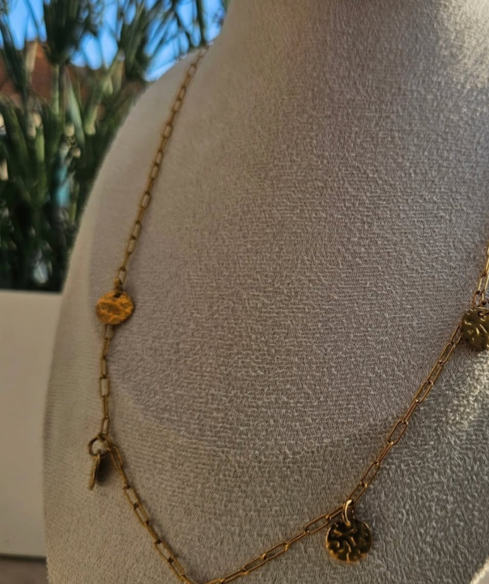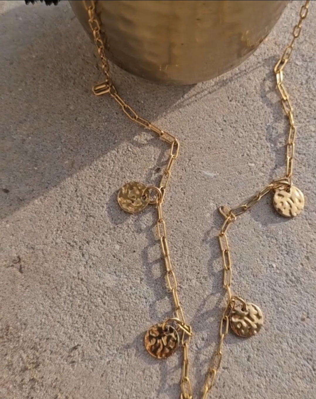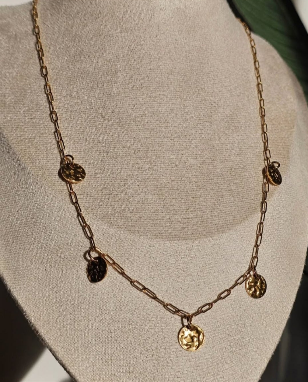 Collier dorĂ© en acier inoxydable, rehaussĂ© de petits mĂ©daillons âïž qui captent la lumiĂšre et subliment vos tenues â Ă©tĂ© comme hiver.